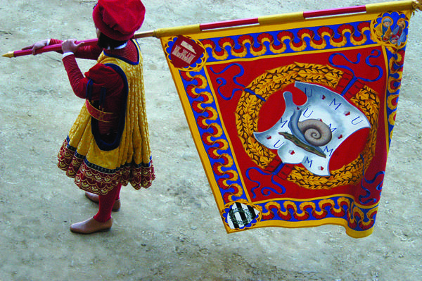 When this magnificent pageant has slowly gone round the square, all the representatives go to sit on a platform raised just for the purpose beneath the windows of the "Palazzo Pubblico". When they have all been seated ther, they look like a strange army after some brilliant victory, or a train of heroes or of poets ready to enter Paradise. As soon as everything is quiet, the flag-bearers from all of the "Contrade" perform together with their flags in what is most commonally known as "gioco delle bandiere". They throw them high up into the air and catch them again before they touch the ground; it is a splendid, most decorative display of colours accompanied by the beating of drums, the sound of bugles and trumpets and the chimes of the big bell on top of the "Mangia" tower; the little bell on the chariot, known in Siena as "Martinella", is also very busy ringing.